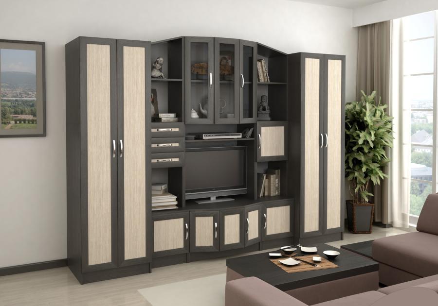 Производители мебели предлагают огромный выбор изделий, из которых можно собрать оригинальную конструкцию по собственному вкусу. В некоторых случаях комплект может представлять собой всего лишь несколько полок, тумбу под телевизор и небольшую горку. А в других вариантах собирается полноценная стенка с множеством шкафов, витрин, тумб и комодов.