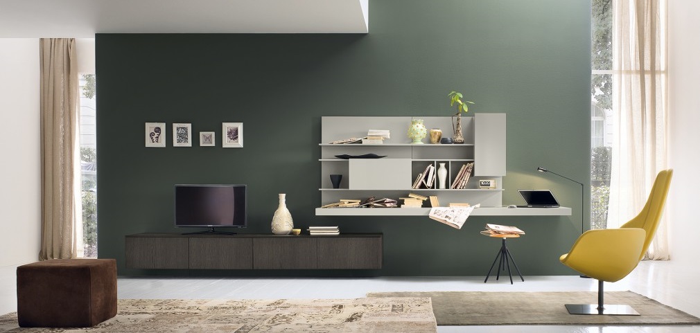 Одно из главных отличий стиля модерн – склонность к асимметрии. В современном варианте это означает возможность располагать элементы стенки на разной высоте и не добиваться симметрии по какому-либо признаку.