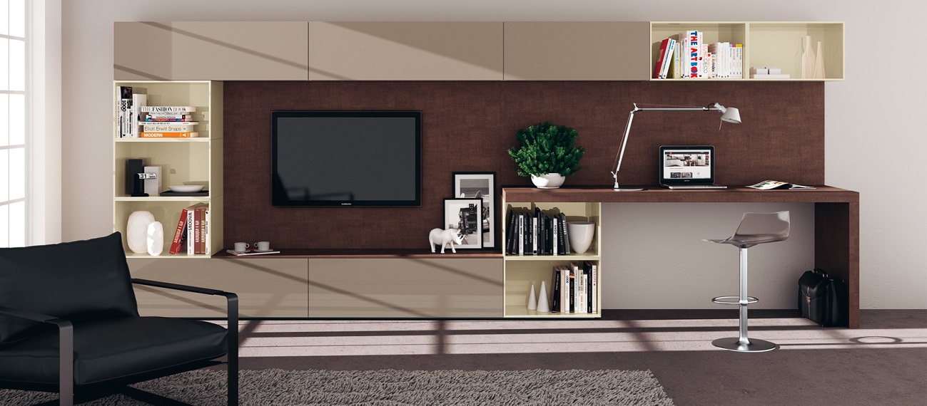 Однако по отношению к нему высота и ширина пеналов и шкафов с обеих сторон может быть как одинаковой, так разной. Особенно эффектно такое решение смотрится на мини-гостиных.