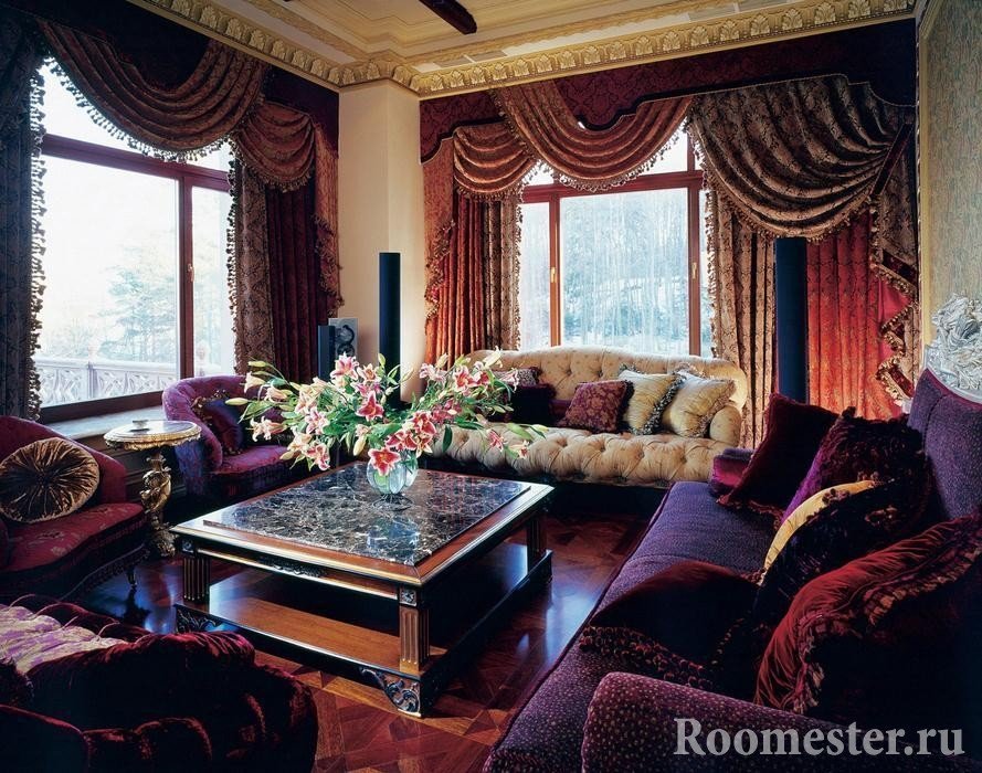 Все текстильные предметы интерьера: диванные подушки и валики, покрывала, портьеры, скатерти – обязательно должны быть сшиты из дорогих красивых тканей и соответствовать всей роскошной окружающей обстановке.