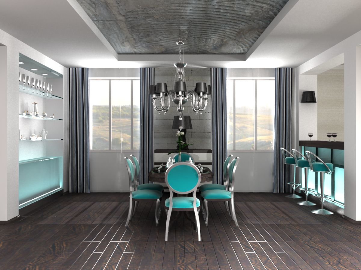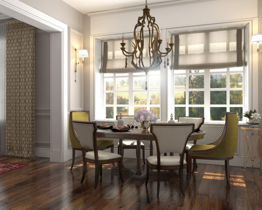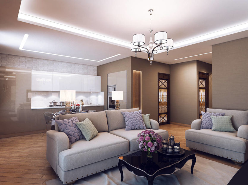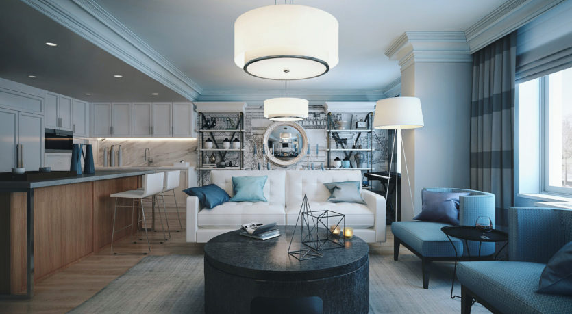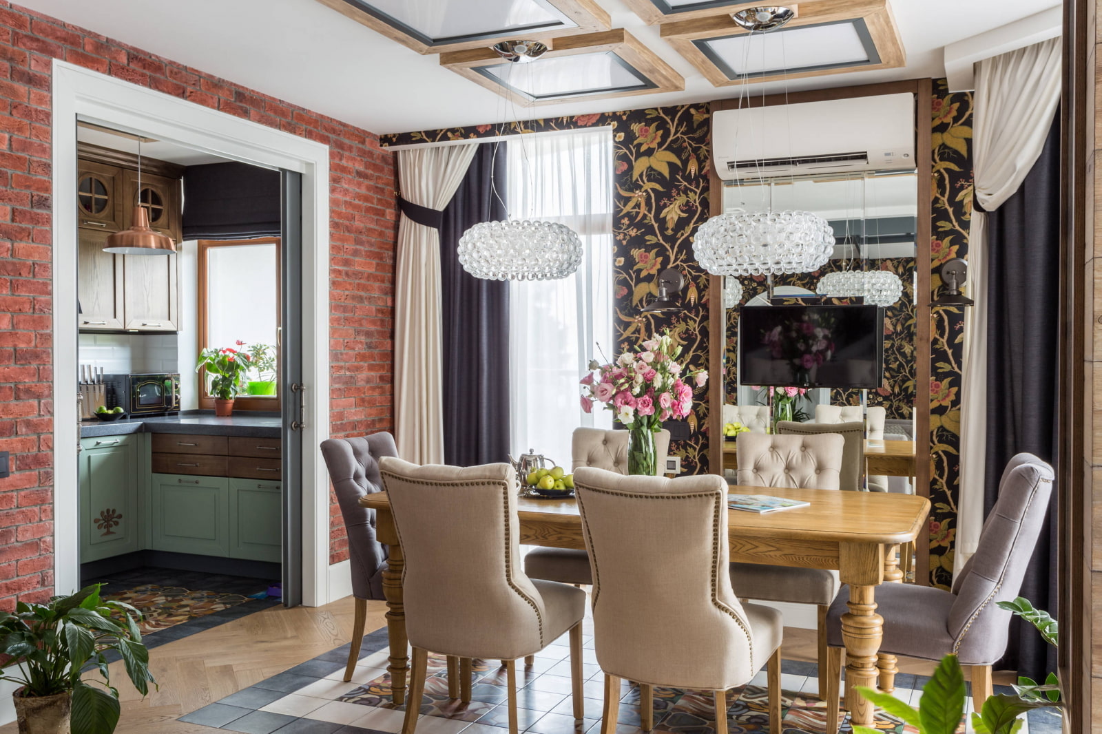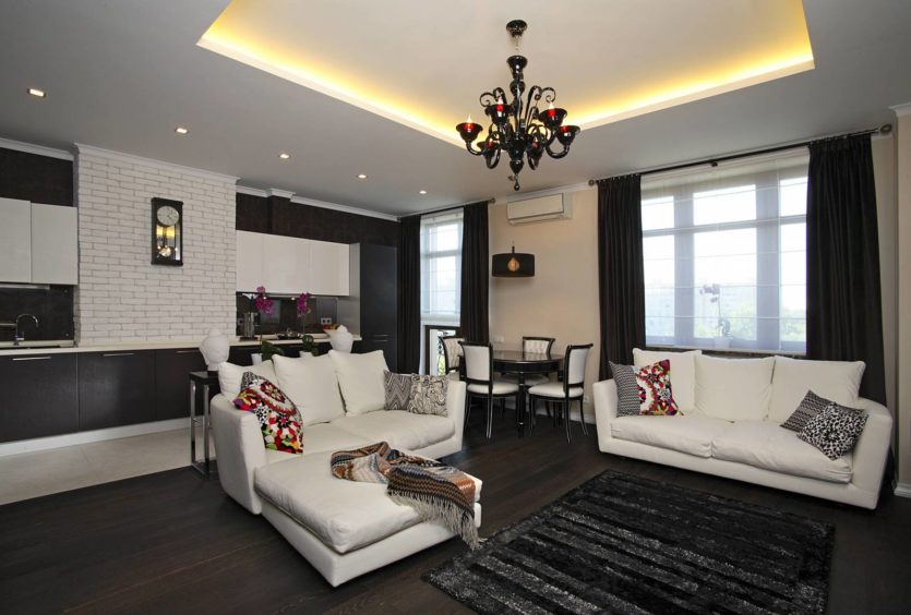 Потолок может быть цветным – в тон стенам, гарнитуру или контрастным. На потолке возможна лепнина, карнизы, плинтусы. Потолок оформляется в зависимости от направлений, которые взяты за основу. Он может поддерживать классический стиль, в таком случае он должен быть белым с аккуратными плинтусами и лепниной вокруг центральной люстры. Если используются элементы лофта, то на потолке можно оставить балки.