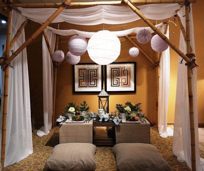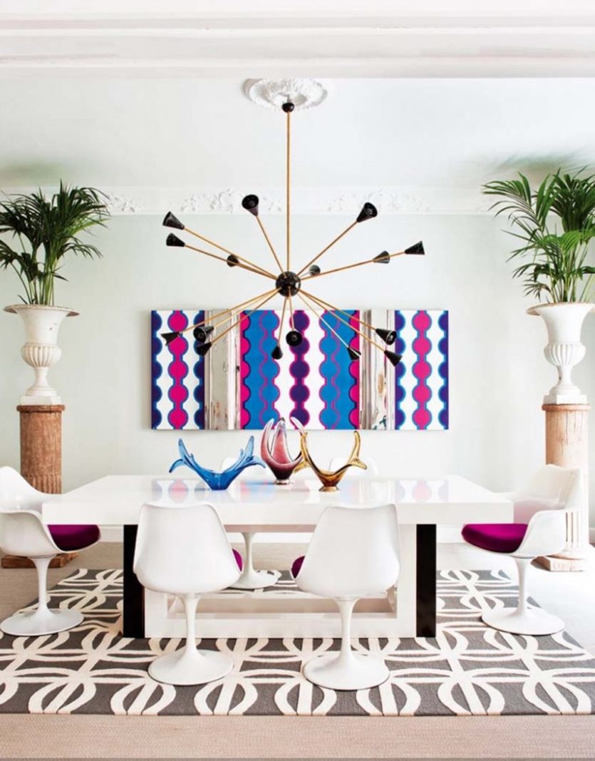 Не стоит использовать слишком яркие элементы, достаточно соединить классику с этникой, разбавив четкие лаконичные формы элементами, свойственными первозданной природе. Для этого можно задействовать необычные светильники, фотообои, растения разного происхождения.