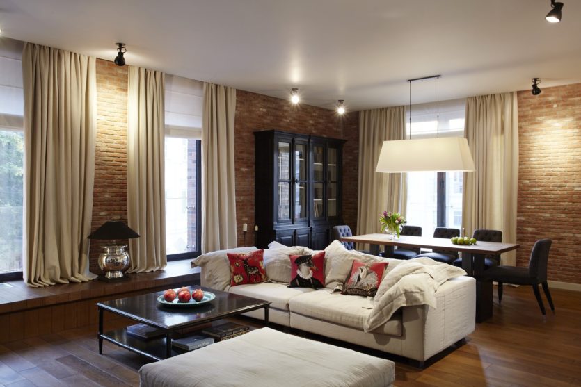 - отделка стен с использованием натуральных материалов, например, кирпича, или дерева;