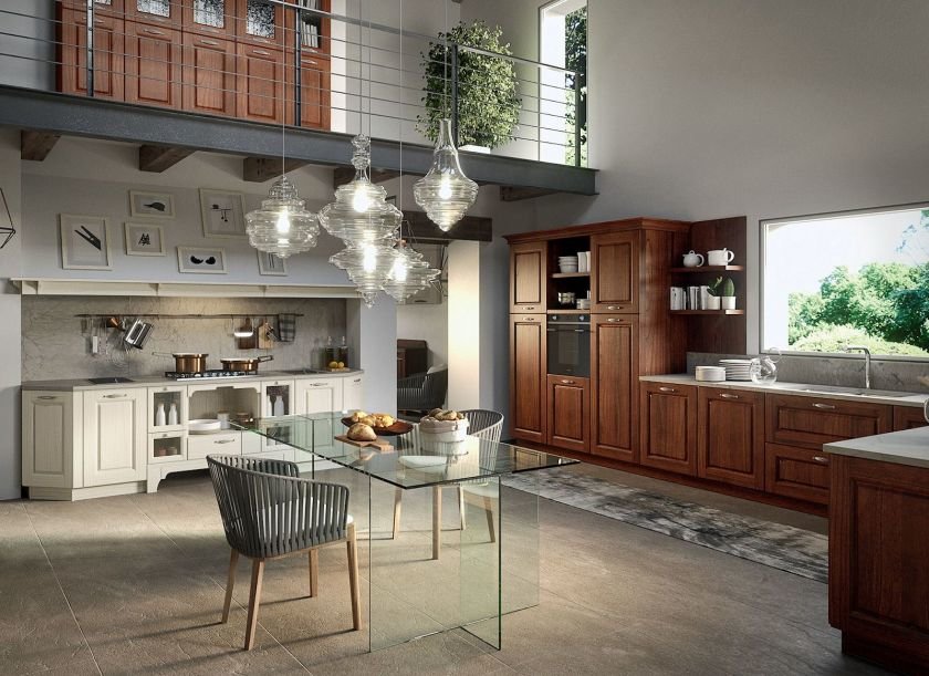 В рабочей зоне может быть плитка или кладка из кирпича или камня, в обеденной – обои, краска или фотообои. Также стены кухни могут быть полностью покрыты штукатуркой, при этом две любые стены выделяют с помощью другой фактуры или цвета.