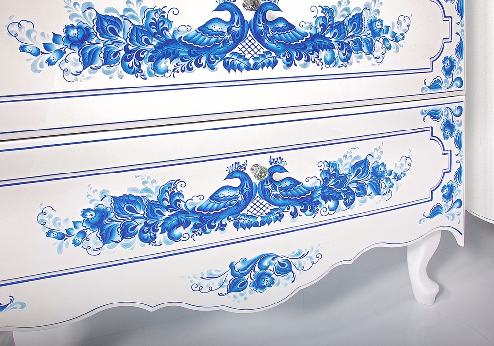 - мебель с бело-синим узором. Вы можете самостоятельно создать такую мебель, нанеся краску с помощью трафаретов, но проще купить ее, многие фабрики производят целые коллекции изделий, декорированных изображениями цветов, ягод;