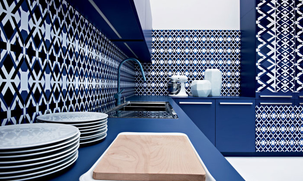 Современная кухня украшена аксессуарами с бело-голубым орнаментом