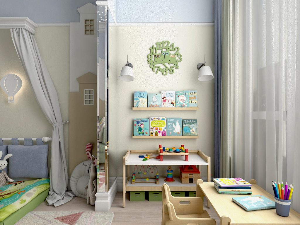Очень важно грамотно распределить зоны для сна, игры и учебы. По максимуму разгрузить пространство помогают вместительные системы для хранения игрушек. На светлых стенах приветствуются яркие рисунки, контрастные трафареты и глянцевые интерьерные наклейки