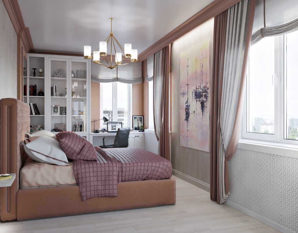 Стильный, лаконичный интерьер комнаты практичен и функционален. Мягкий серо-розовый тон мечта каждой леди. Нежно-розовый цвет органично вписывается в интерьер. Интересным решением оформления становится триптих с изображением цветка, перекликаясь по цвету с текстильными элементами, картина помогает выгодно расставить необходимые акценты.