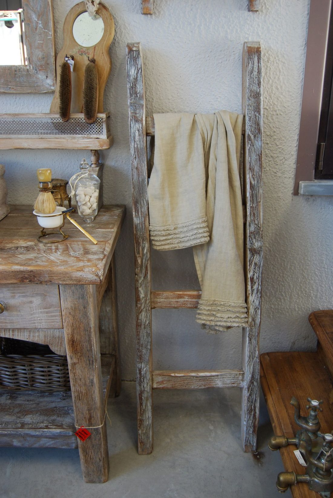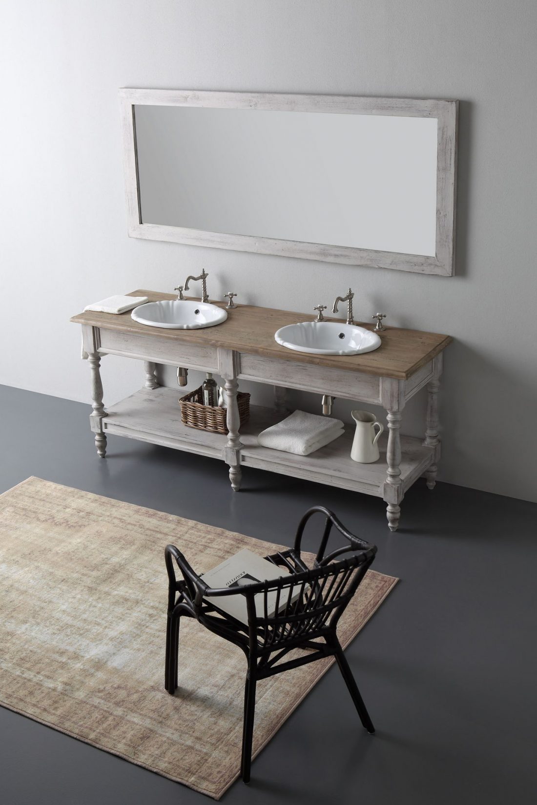 В качестве стилевых аксессуаров в ванной присутствуют тонкие кованые, либо стилизованные под сельский быт вешалки для полотенец, плетеные корзинки из лозы, зеркало, обрамленное рамой ручной работы.