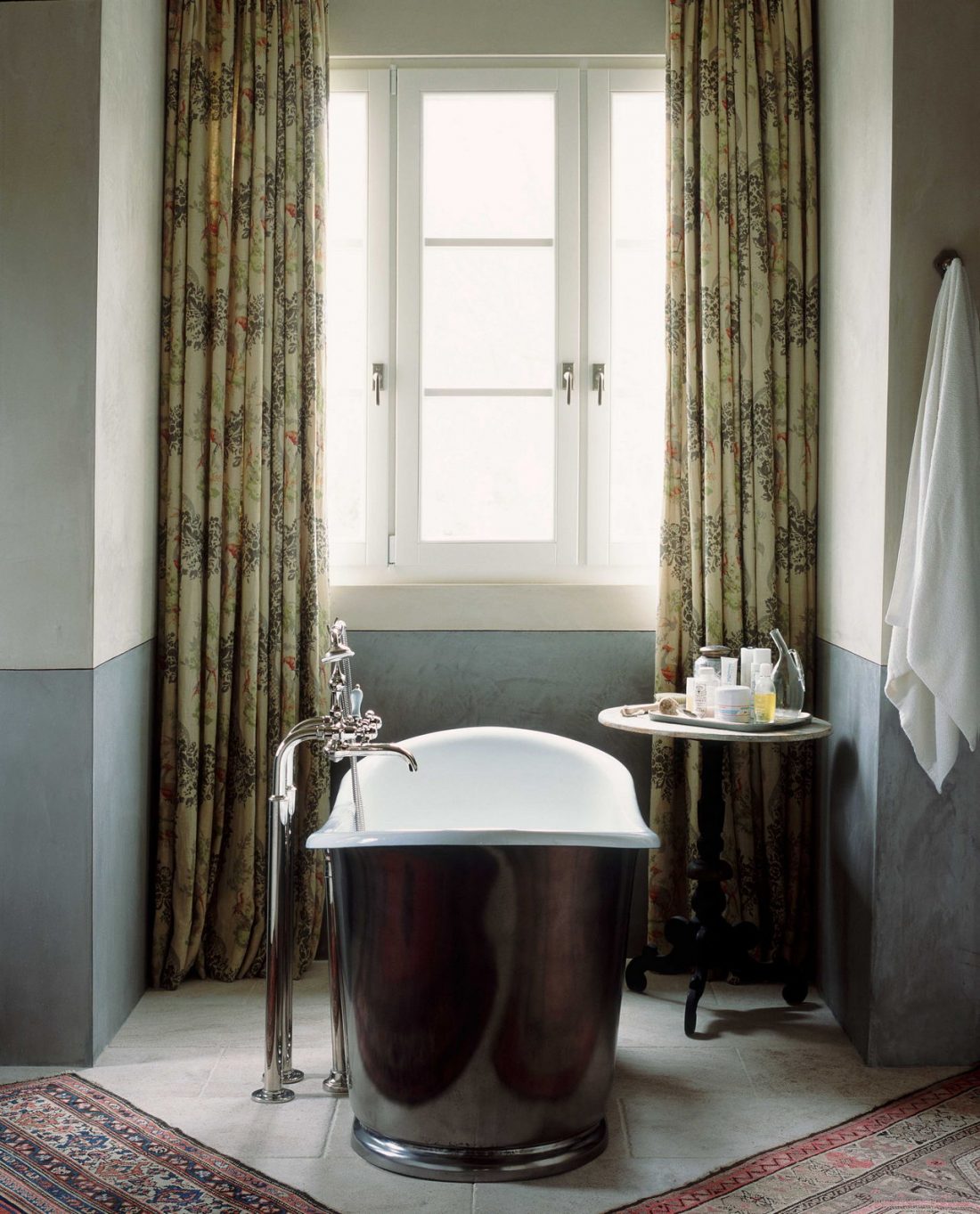Для стен рекомендуется выбирать варианты с узорами, соответствующими стилю, а для пола хорошо подойдет текстура, имитирующая натуральное дерево. Из ярких элементов плитки или мозаики можно сложить своеобразный коврик перед ванной, в центре комнаты, или украсить маму ванну, а стену декорировать красочным панно.