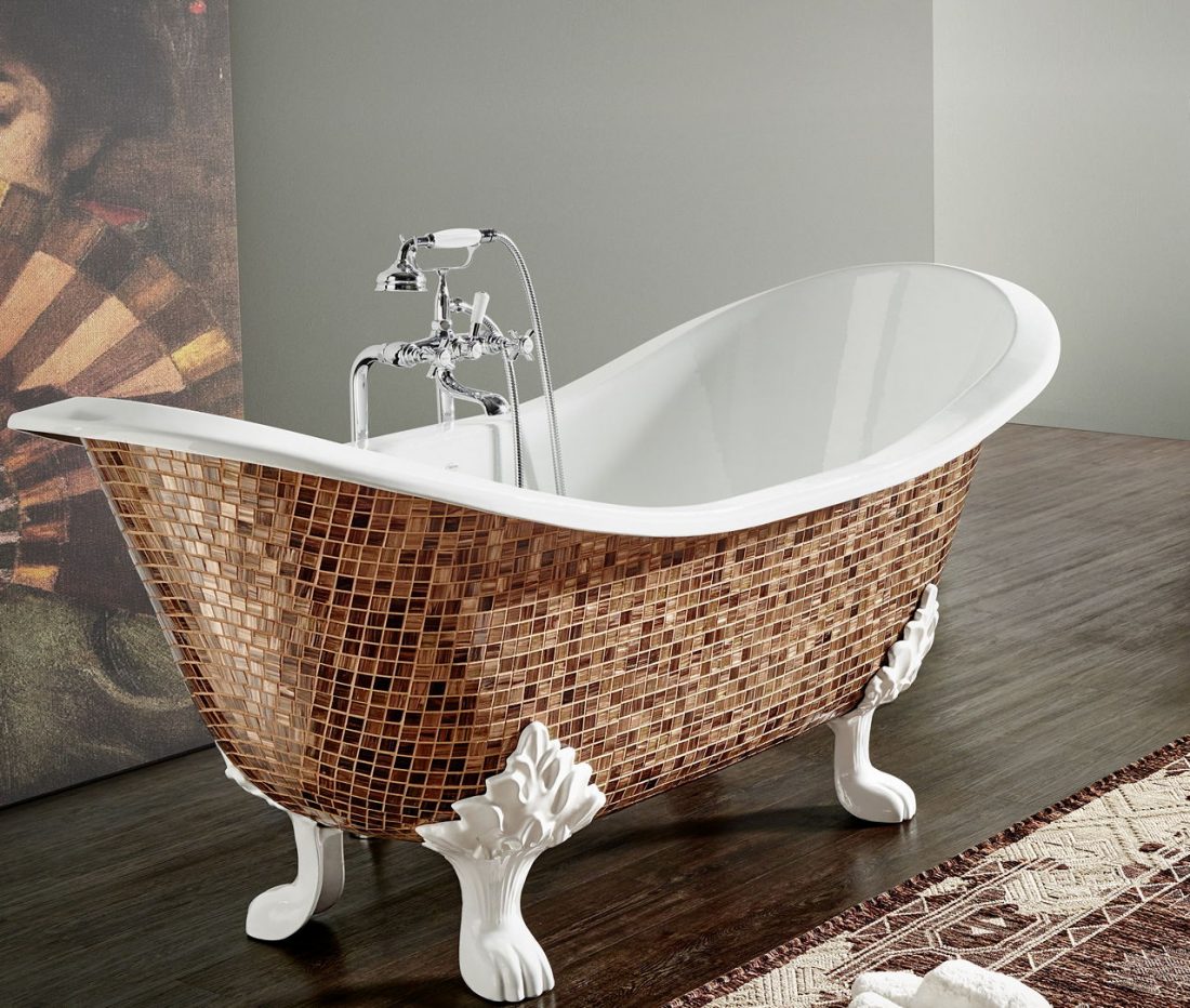 Имеющая овальные очертания ванна стоит обособленно на изогнутых ножках. Сделанная из чугуна либо акрила, она может быть защищена планшетным экраном, драпированным под дерево.