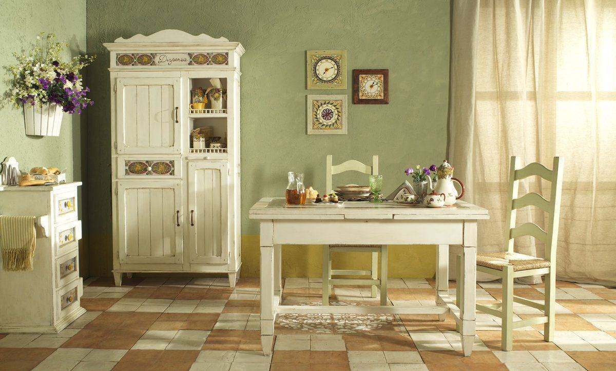 Кухня в провансальском стиле ориентирована на светлые цвета с преобладанием белого и его оттенков, а также серого, бежевого или зеленого. Рядом с ними будут гармонично смотреться насыщенные оттенки, но они должны появиться в компании ранее упомянутых цветов, создавая гармоничное целое. Для стен очень часто выбирают отбеливающую отделку, также популярны декоративные штукатурки или структурные краски. Для кухонного пола в провансальском стиле укладывают деревянные, кафельные или каменные полы.