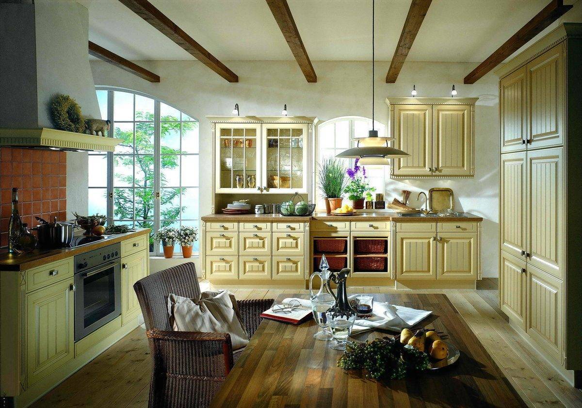 Идеальным вариантом будет объединенная кухня-столовая. Отделка стен выполняется штукатуркой светлого тона, нанесение грубое, с заметными неровностями и шероховатостями. Выбор напольного покрытия отдается в пользу дерева, паркета с имитацией дерева и плитки.