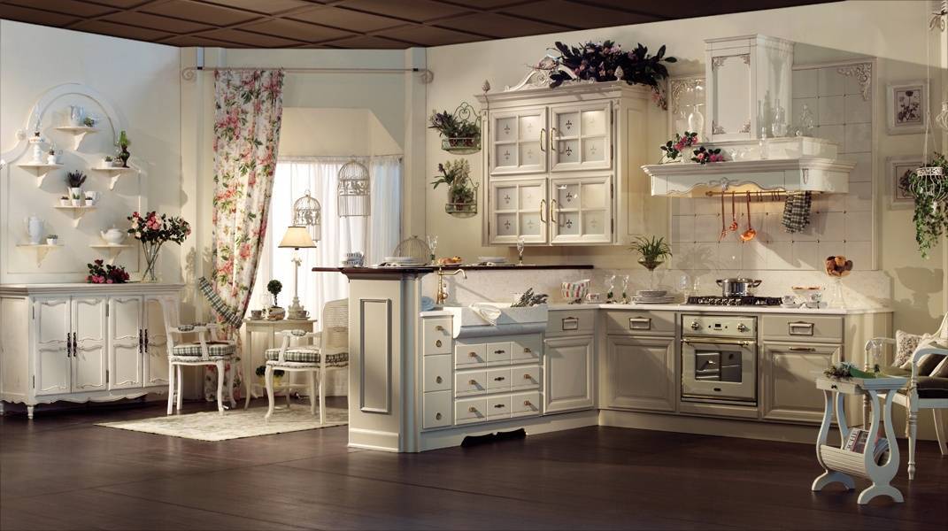 Мебель для кухни выбирается с плавными линиями и в светлых тонах. Ее отличительной особенностью является наличие открытых полочек, царапины на фасадах, дверцы со стеклянными вставками.