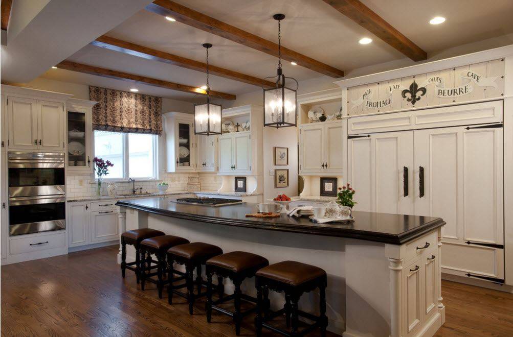 - Потолку. Здесь применяется белая или бежевая краска, фактурная штукатурка, побелка. Отличительной особенностью стиля прованс является наличие деревянных балок. Конечно же, в городских квартирах они не встречаются, поэтому их легко можно заменить фальшбалками, изготовленными из бруса и досок.
