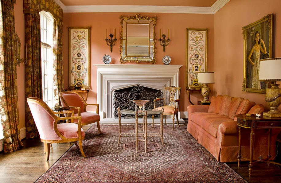 Обязательный атрибут интерьера рококо – камин, отделанный натуральным камнем. Он должен быть заставлен различными вещицами: часами, канделябрами, фарфоровыми безделушками. Обычно над камином расположено зеркало в богатой позолоченной раме или картина.