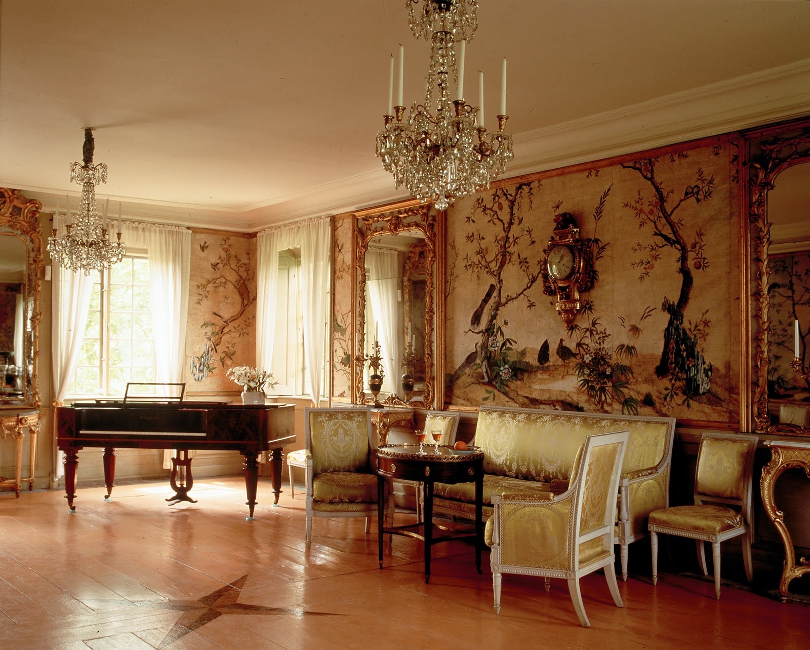 В отделке стен – шелковые, глянцевые ткани или краска с мягким блеском, гобелены с китайскими и цветочными мотивами; зеркала и картины в позолоченных рамах.