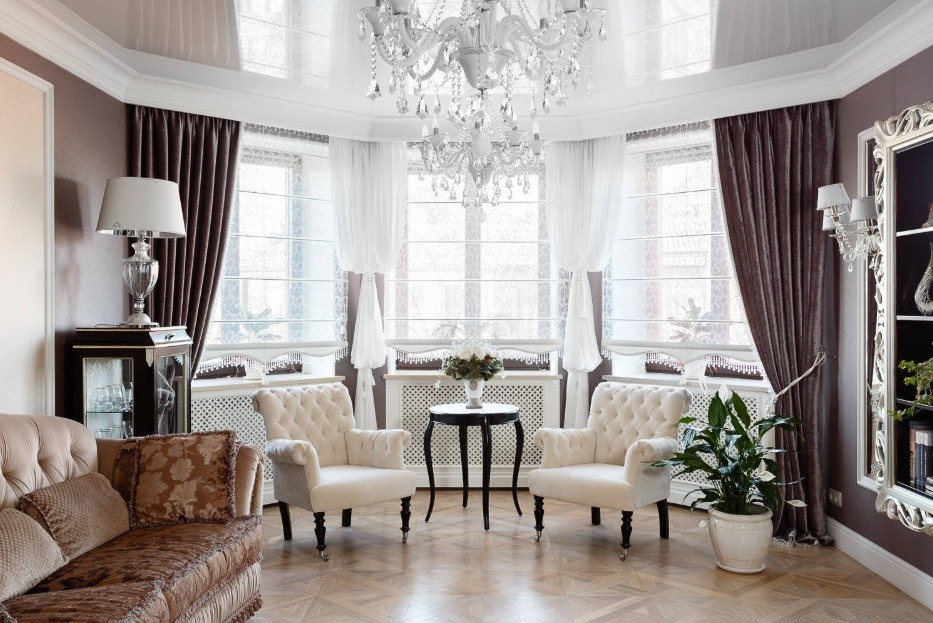 Минимальное количество мебели. Классика не предполагает использование громоздких стен, стеллажей, шкафов.