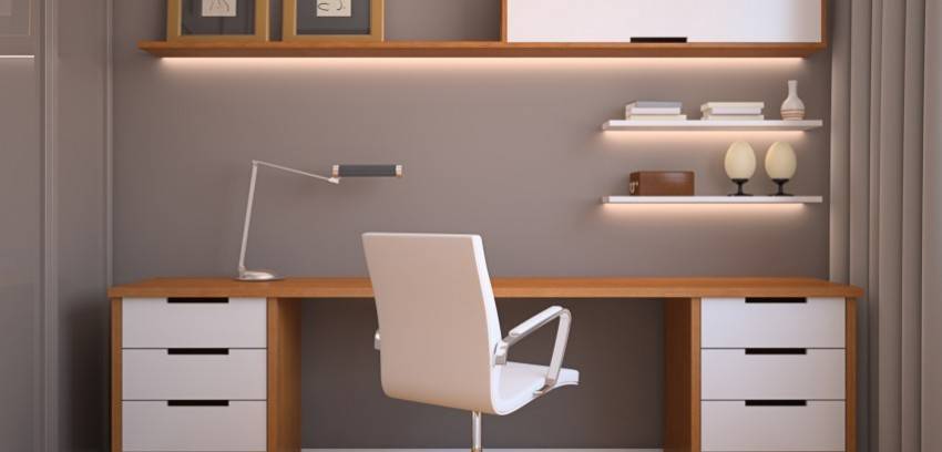 Основные плюсы такого варианта: минимально занятое место и хорошее освещение. Выбирая встроенный стол, необходимо правильно рассчитать его высоту. Он должен быть удобным для использования.