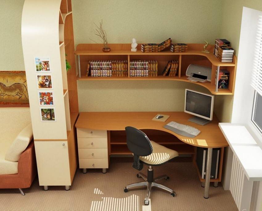 В маленькой детской комнате хорошим вариантом будет угловая рабочая поверхность, оснащена многочисленными тумбочками и полками. Они не занимают много места, свободный доступ на расстояние вытянутой руки позволяет без труда положить или достать любую принадлежность.