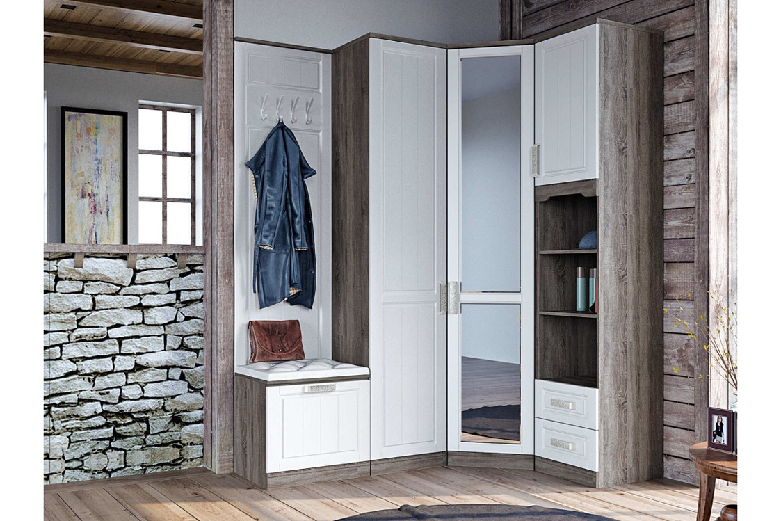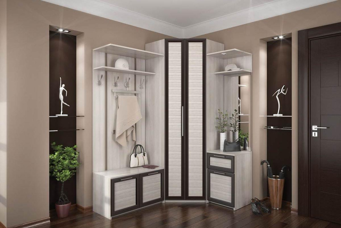 Компактно выглядят угловые конструкции. В отличие от прямоугольных моделей, они более вместительные и эргономичные. Изделие с двух сторон может быть дополнено полками, тумбами или специальными обувными секциями.