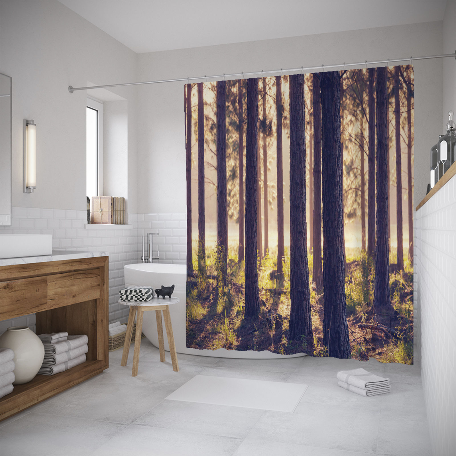 Если у вас за окном открывается чудесный безлюдный пейзаж, то проём не стоит закрывать какими-либо занавесками. Наоборот, устанавливайте напротив окна ванну для купания и любуйтесь красотой природы.