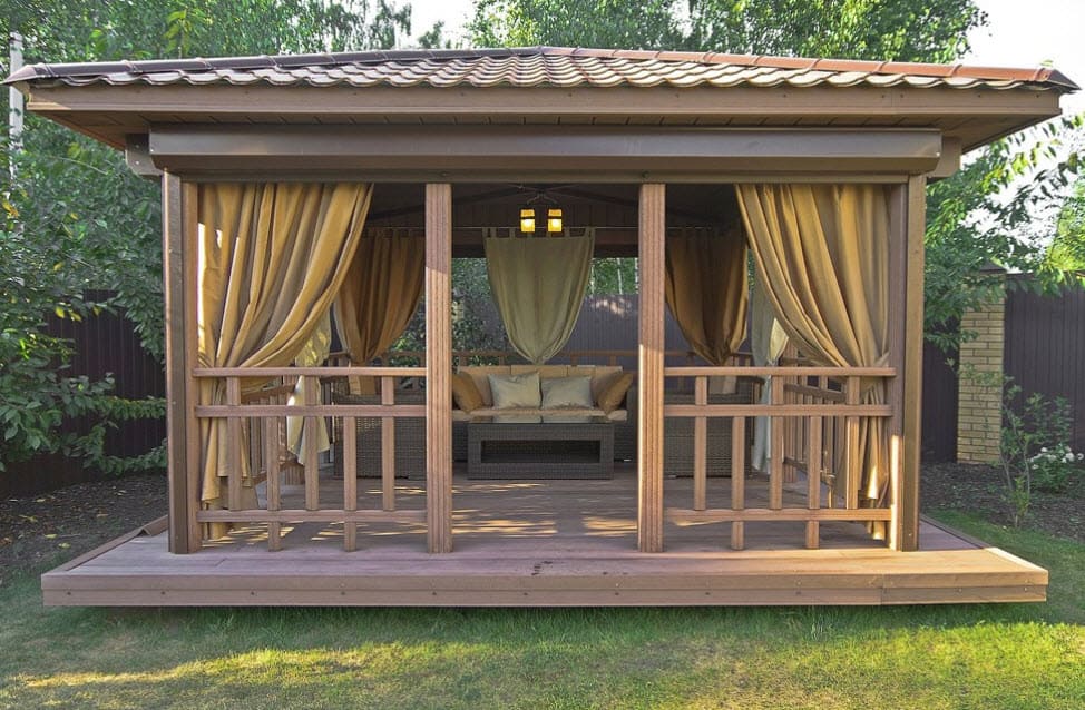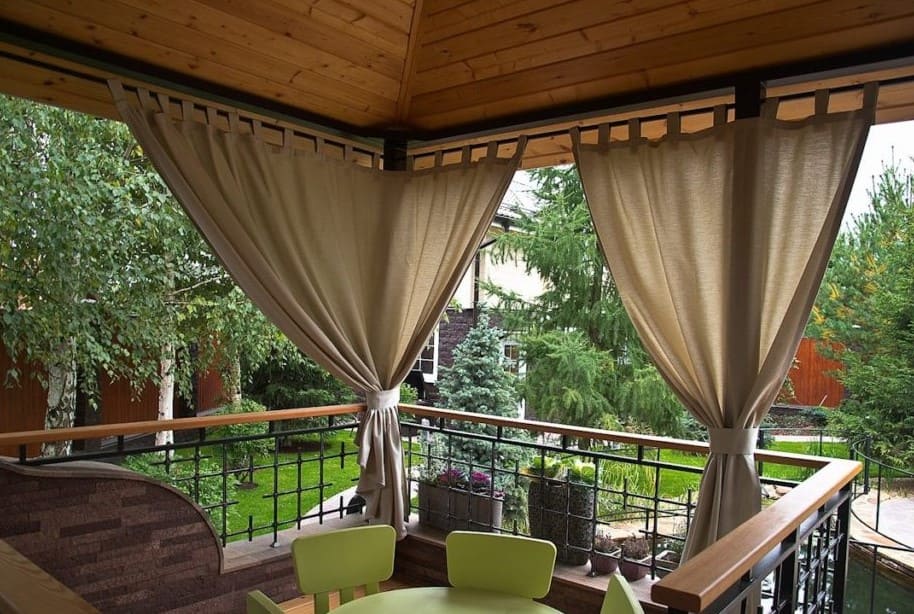 Совет! Для беседки или веранды лучше всего подойдут занавески из светлого текстиля, который не будет сильно нагреваться на солнце, а также впишется в любой интерьер, гармонично дополнит ландшафт.