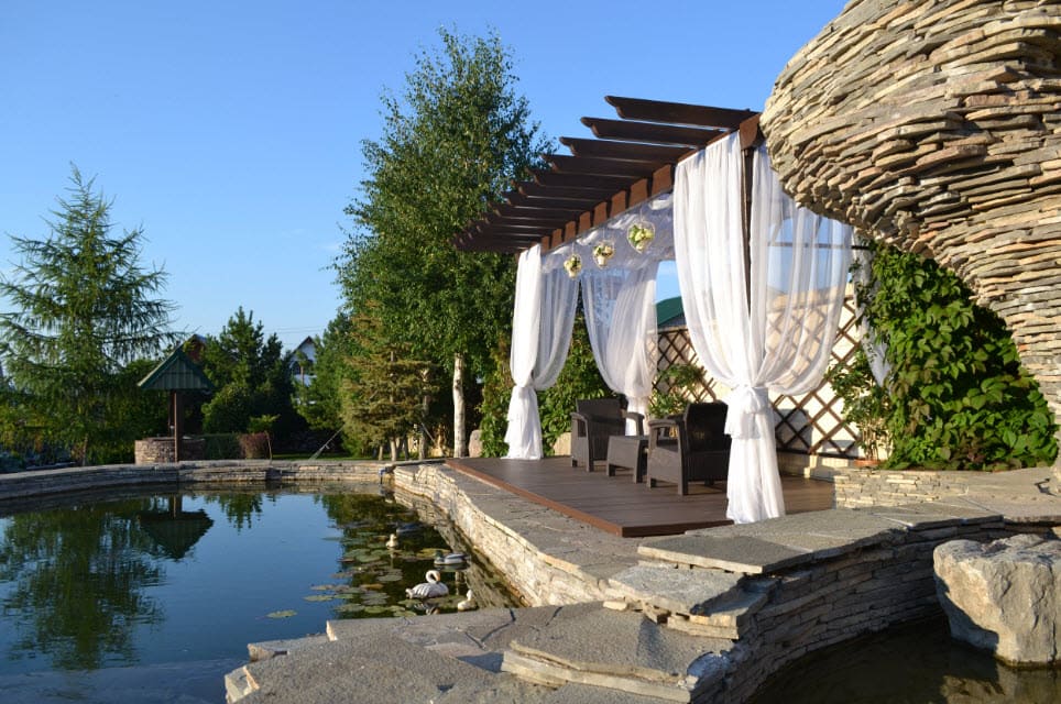 Невесомый легкий тюль в открытой беседке подойдет для теплого времени года