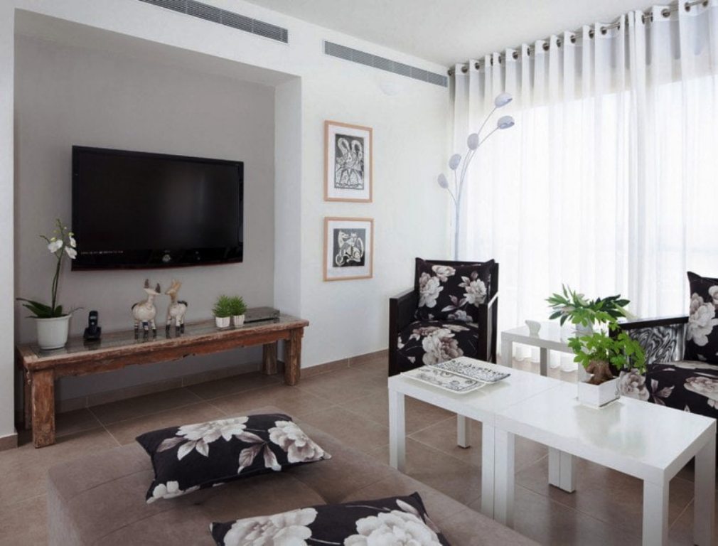 - Третий шаг ― подбор правильного текстиля. Если повесить на окна в маленькой гостиной с низким потолком светлый тюль или портьеры, то комната приобретет дополнительную легкость и воздушность, но станет немного скучной.