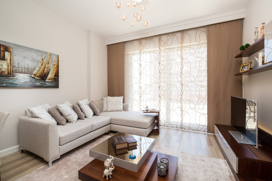Шторы нейтральных цветов – идеальный вариант для тех, кто не уверен, что сможет выбрать нужный оттенок для гостиной. Кремовый, бежевый или песочный – это варианты, что называется, на все времена. Смотрятся ненавязчиво и всегда уместны.