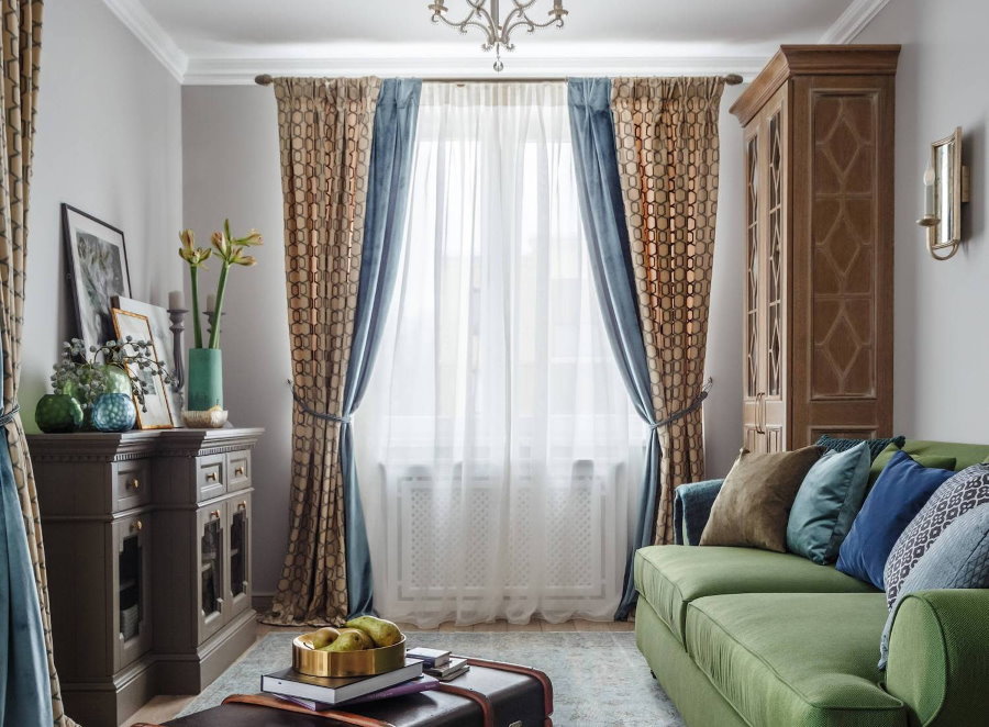 Плотные портьеры станут идеальным выбором для квартиры на первом этаже, или в случае, когда рядом расположен такой же жилой дом «окна в окна». Также такие занавески выбирают любители дневного полумрака. На самом деле, когда окна выходят на солнечную сторону, далеко не каждый человек выдержит прямые солнечные лучи в течение дня. Но выбирая подобные занавески, помните, что в маленьких гостиных они «скрадывают» пространство и даже смотрятся нелепо. Поэтому, если вы стремитесь обеспечить надежную защиту от света в гостиной небольших габаритов, выбирайте жалюзи или римские шторы.