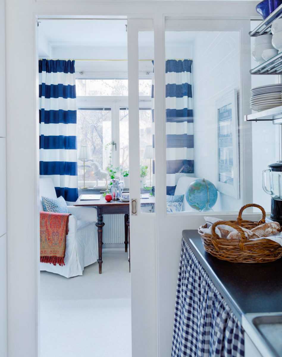 Легкий морской стиль в шторах на кухню создает атмосферу уюта.