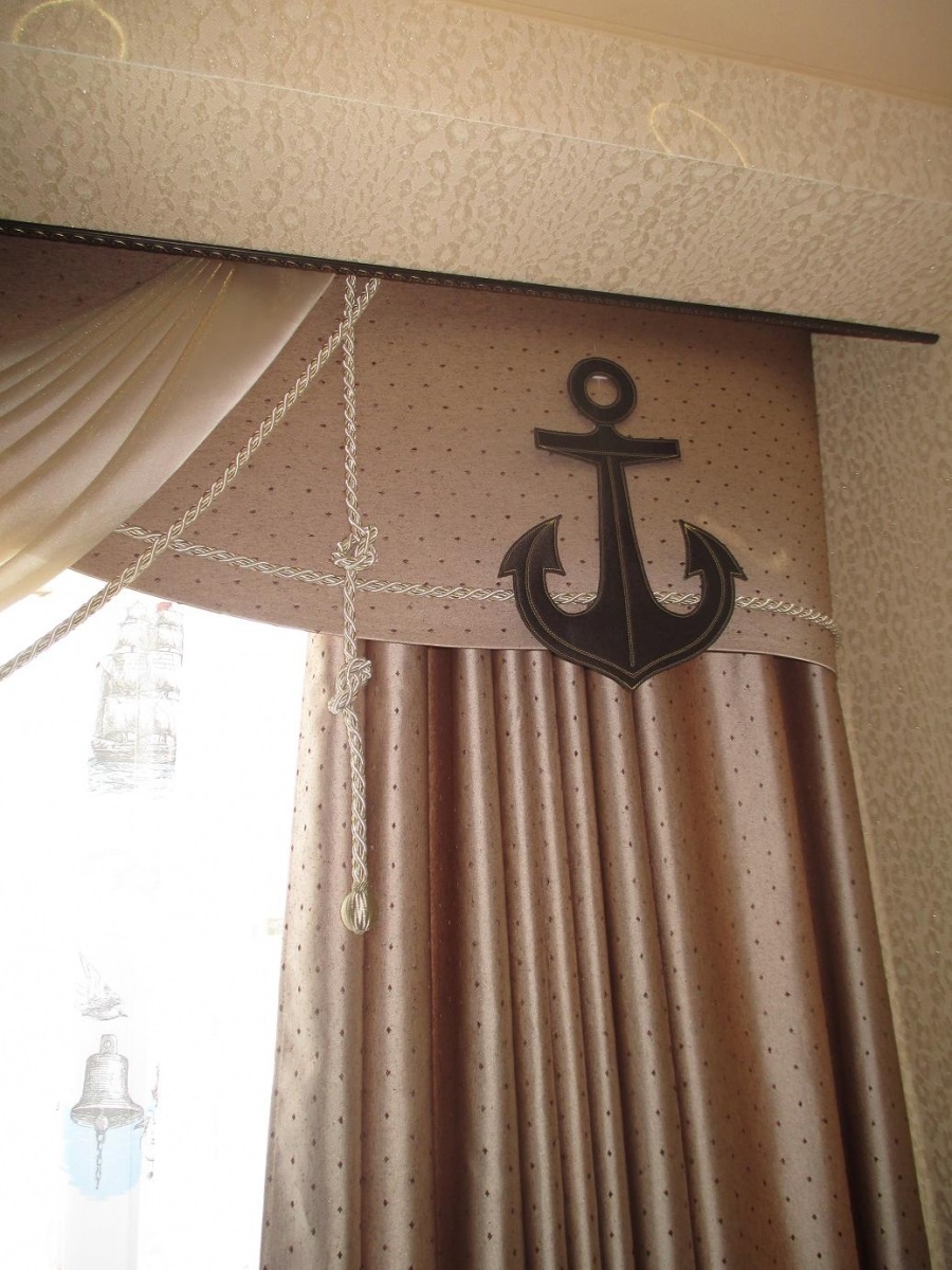 При оформлении таких портьер используют подхваты, стилизованные под морские канаты, деревянные карнизы с кольцами, заколки для штор в виде корабельных штурвалов, морских коньков и т.д.