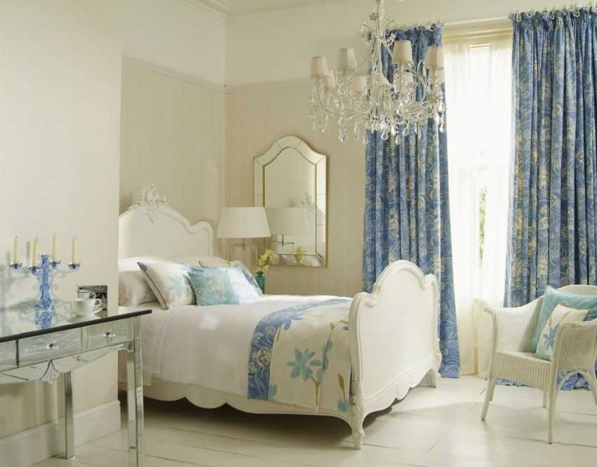 В спальне не рекомендуется злоупотреблять яркими контрастными цветами. В последние годы дизайнеры предпочитают использовать приглушённые насыщенные оттенки без глянца. Двойные портьеры, сочетающие однотонное полотно пастельных оттенков с занавесью с цветочным принтом, отлично подойдут для спальни в стиле прованс (пример таких штор на фото ниже).