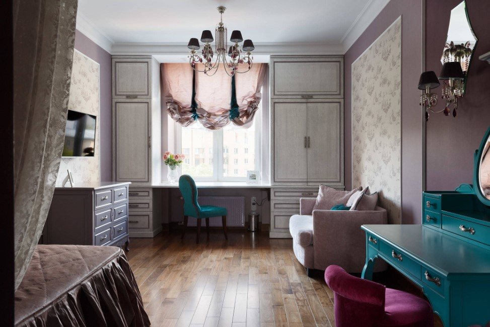 Для обработки стеновых поверхностей стоит отдать предпочтение обоям или прочим светлым материалам отделки. Портьеры нужно выбирать с таким рисунком, чтобы он мог сочетать цвета некоторых других деталей, а для оттенка можно применить римские шторы в одном тоне. Такая же ткань впоследствии может быть применена для оформления декоративных подушек или покрывал.