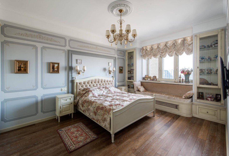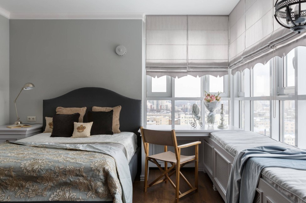 Выбирать шторы в спальню на балконное окно надо с учетом присутствия двери, которую придётся использовать по назначению. Стандартные модели занавесок обычно мешают свободному доступу к створкам. Особенно, если используются сложные классические варианты штор.
