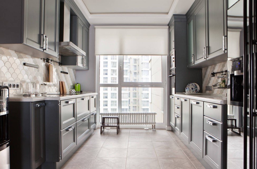 Для небольшой кухни подходят короткие шторы, длина которых на 10 см ниже уровня подоконника. Если кухня с балконом, длина штор должна быть до пола.