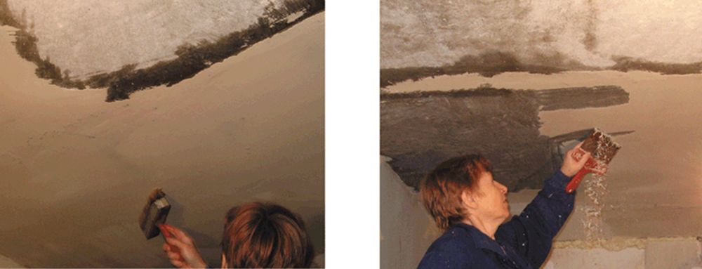 Выше упоминалось, что первично делается простукивание и отшелушивание потолка своими руками от старой штукатурки. Прочные участки такому процессу трудно поддаются. Здесь подход иной, сначала следует намочить их водой, дав пропитаться. Смачивается штукатурка потолка своими руками при помощи губки, тряпки или распылителя. Когда поверхность пропиталась, приступайте к знакомому этапу отбивки киянкой.