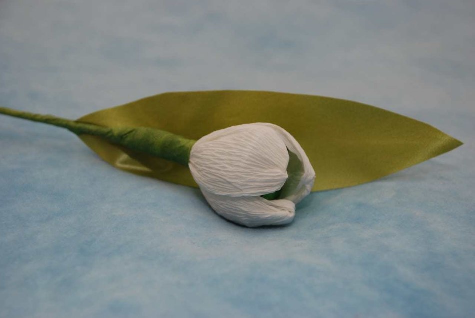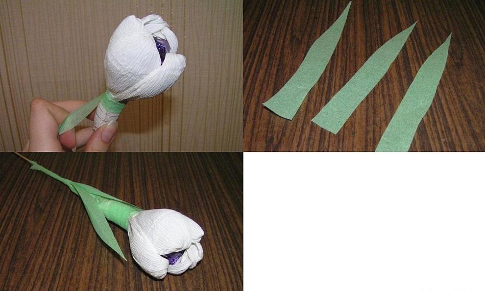 из зеленой бумаги вырезать длинные листочки, примотать снизу, оформить «стебель»