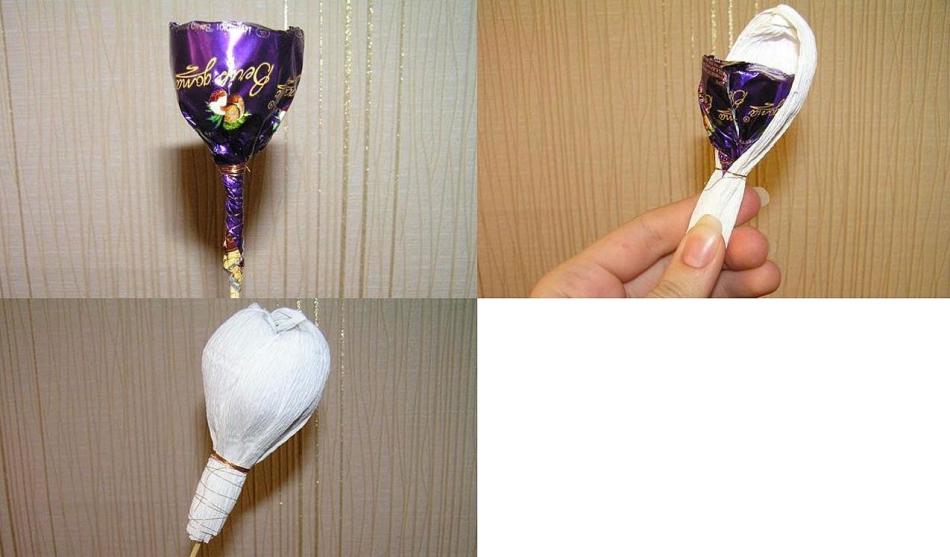 - креповую бумагу нарезать на небольшие полоски, закруглить края, обернуть вокруг конфеты, закрепить ниткой