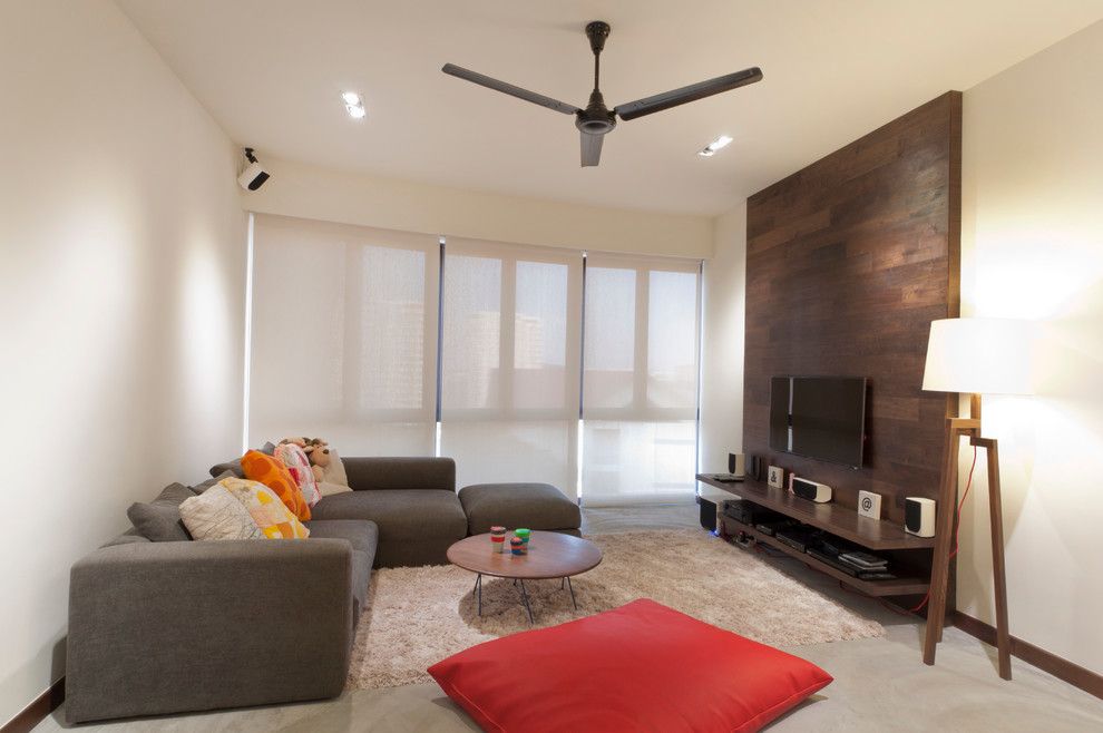 если гостиная выполнена в светлых оттенках, в такой комнате современная плазма будет выглядеть большим черным пятном. Нивелировать дисбаланс можно с помощью акцентной стены, на которой закреплен телевизор. С этой целью используют контрастные цвета, в сравнении с основными светлыми тонами интерьера. Если гостиная выдержана в единой гамме, стену выделяют цветом на три тона темнее основного;