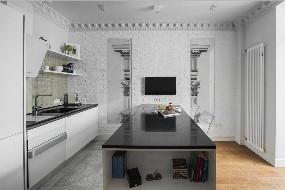 При планировке кухни закладывается специальное место, куда позже помещают телевизор.