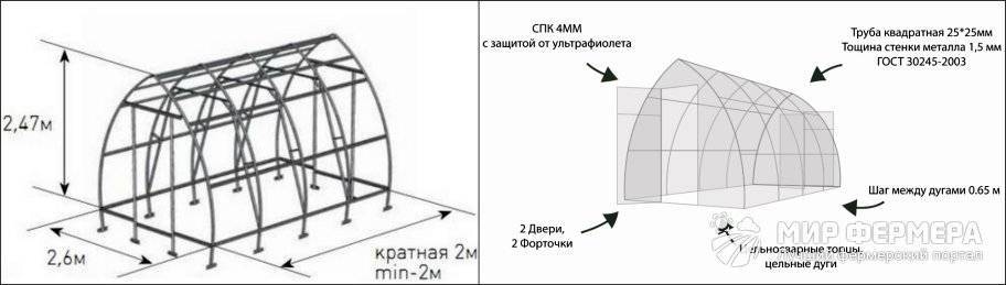 Основными техническими характеристиками парника из поликарбоната считается надежность и прочность сооружения, которое состоит из цельносварных дуг и торцевых модулей с двумя дверьми и двумя форточками. Между дугами расстояние равняется 63 см. Для повышенной нагрузки от снега две горизонтали из четырех смещаются кверху в виде капли. Крепление поликарбонатных материалов происходит саморезами, а детали каркаса крепятся болтами и гайками.
