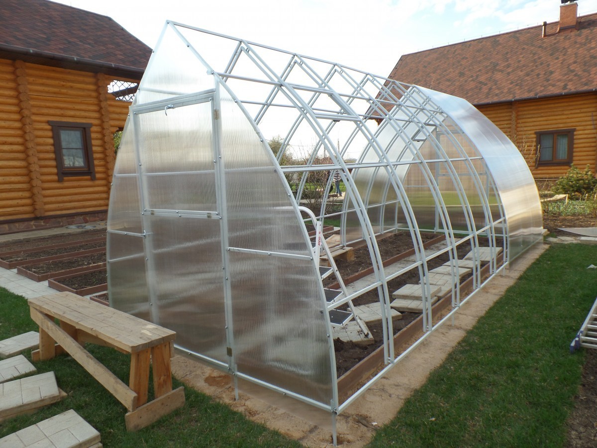 Такая теплица отличается удобством и функциональностью, а для того, чтобы ее собрать используются промежуточные и торцевые составляющие с дверью и форточками. Для каркаса применяют двери и форточки, дуги, прямые и продольные материалы, фундамент и фурнитуру. Для покрытия крыши используют поликарбонатный материал, термошайбы и уплотнительную ленту, саморезы, торцевые и соединительные профили.