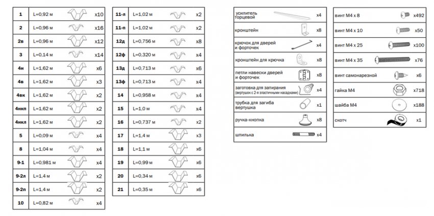 - Сперва проводят сортировку всех необходимых компонентов технических узлов на элементы крыши и боковых стенок, после чего и приступают к их сборке.