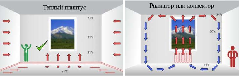 В отличие от радиаторов отопления, тепловая энергия, исходящая от теплого плинтуса, распределяется более равномерно, благодаря этому обеспечивается одинаковый прогрев по всей высоте
