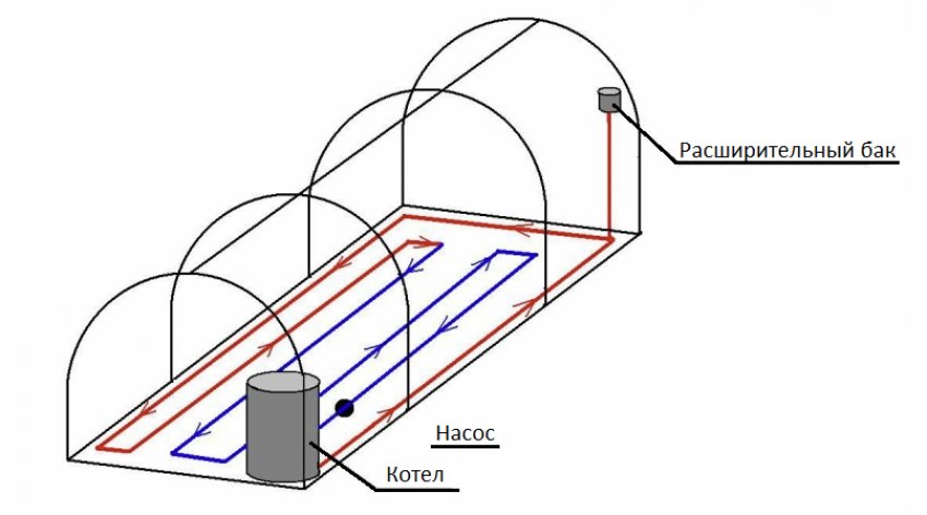 При нахождении теплицы на дальнем расстоянии прокладывают трубы от дома до теплицы под землей. Понадобится затрата дополнительных сил и ресурсов для изоляции трубок, проходящих по улице. А также установка дополнительного аппарата для обогрева теплицы. Отопительная система состоит из: