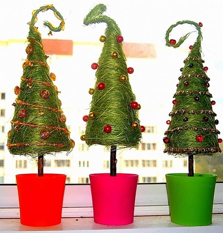 - Сделать шар можно из газеты, скомкав ее и перемотав скотчем, а готовый пенопластовый шар покрыть зеленой акриловой краской или приклеить на него сизаль. Кстати, последний вариант смотрится намного богаче, но такая поделка по себестоимости будет на 300−500 рублей дороже.