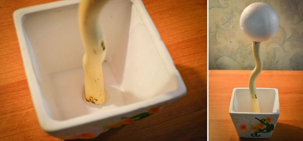 В готовом шаре вам нужно сделать отверстие, куда горячим клеем зафиксируется подходящая коряга. А другой конец коряги нужно так же приклеить на дно горшочка. Кстати, клея на дно не жалейте, и подольше зафиксируйте корягу, чтобы она надежно прикрепилась.