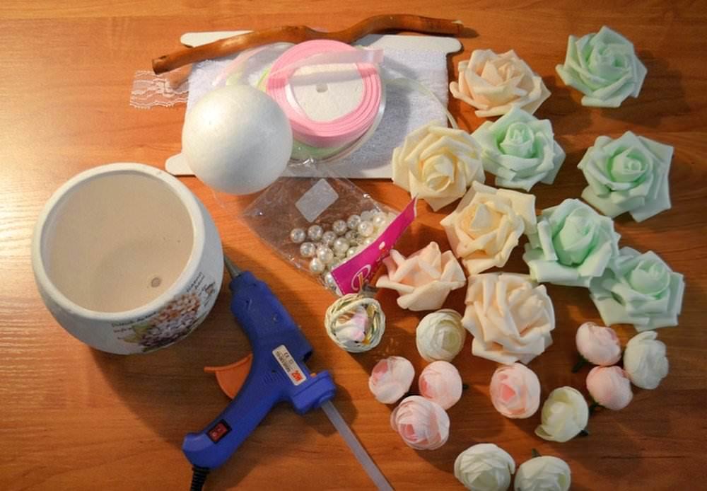 Для изготовления топиария необходимо приготовить соответствующие инструменты. Ножницы, термопистолет или клей ПВА, емкость для смешивания гипса, степлер. Необходимые материалы тоже есть в каждом доме или легкодоступны для покупки: